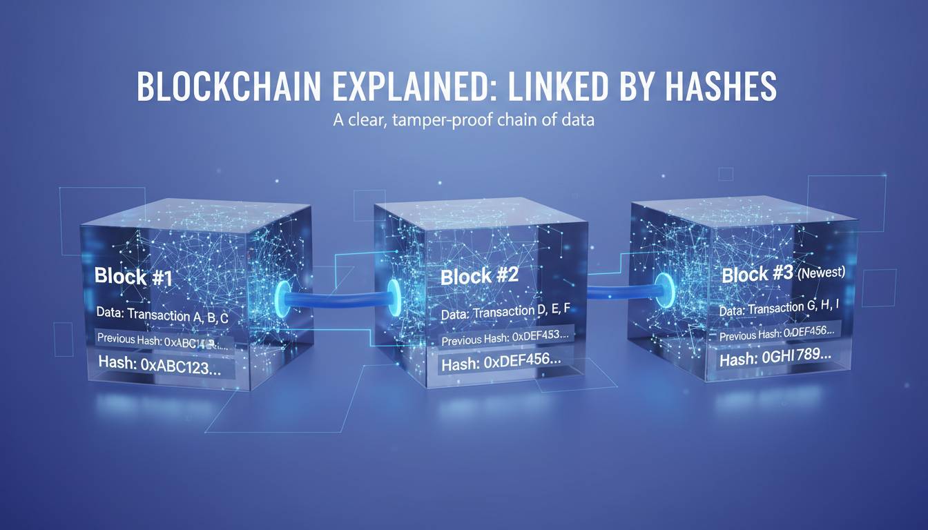 Hashing converts input data of any size into a fixed-size string of characters. Each block’s hash depends on its data and the previous block’s hash—creating a cryptographic chain. This is analogous to a wax seal on an envelope: any attempt to alter the contents would break the seal.