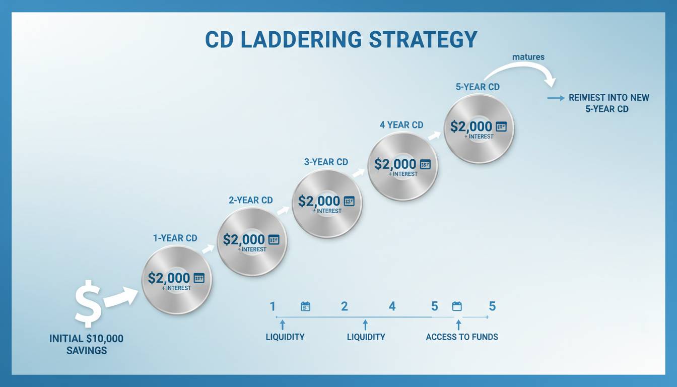 CD ladders are a strategy rather than a product. You divide your savings among multiple CDs with different maturity dates. When the shortest CD matures, you roll it into a new long-term CD. This gives you regular access to some of your money while still capturing higher long-term rates. A typical ladder might have CDs maturing in 6 months, 12 months, 18 months, 24 months, and 30 months, with the cycle repeating as each matures.