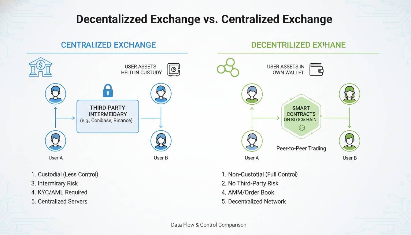 The distinction matters fundamentally: centralized exchanges hold your private keys (and therefore your funds), while decentralized exchanges never take custody. This architectural difference has profound implications for security, privacy, and financial autonomy.
