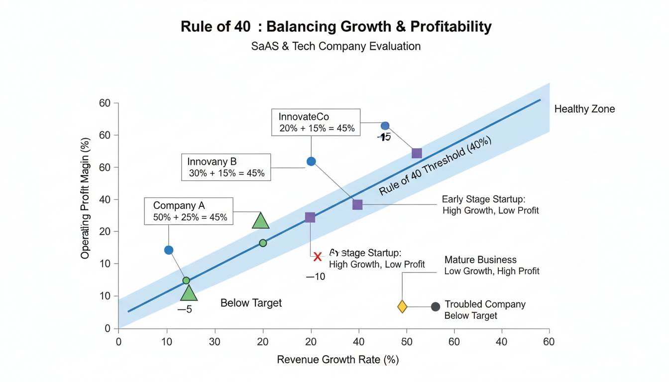 The 60-40 rule is a stricter variant: 60% growth plus 40% profit margin (or some variation) for companies in hyper-growth mode. It applies to the fastest-growing SaaS companies where the market expects exceptional performance on both dimensions.