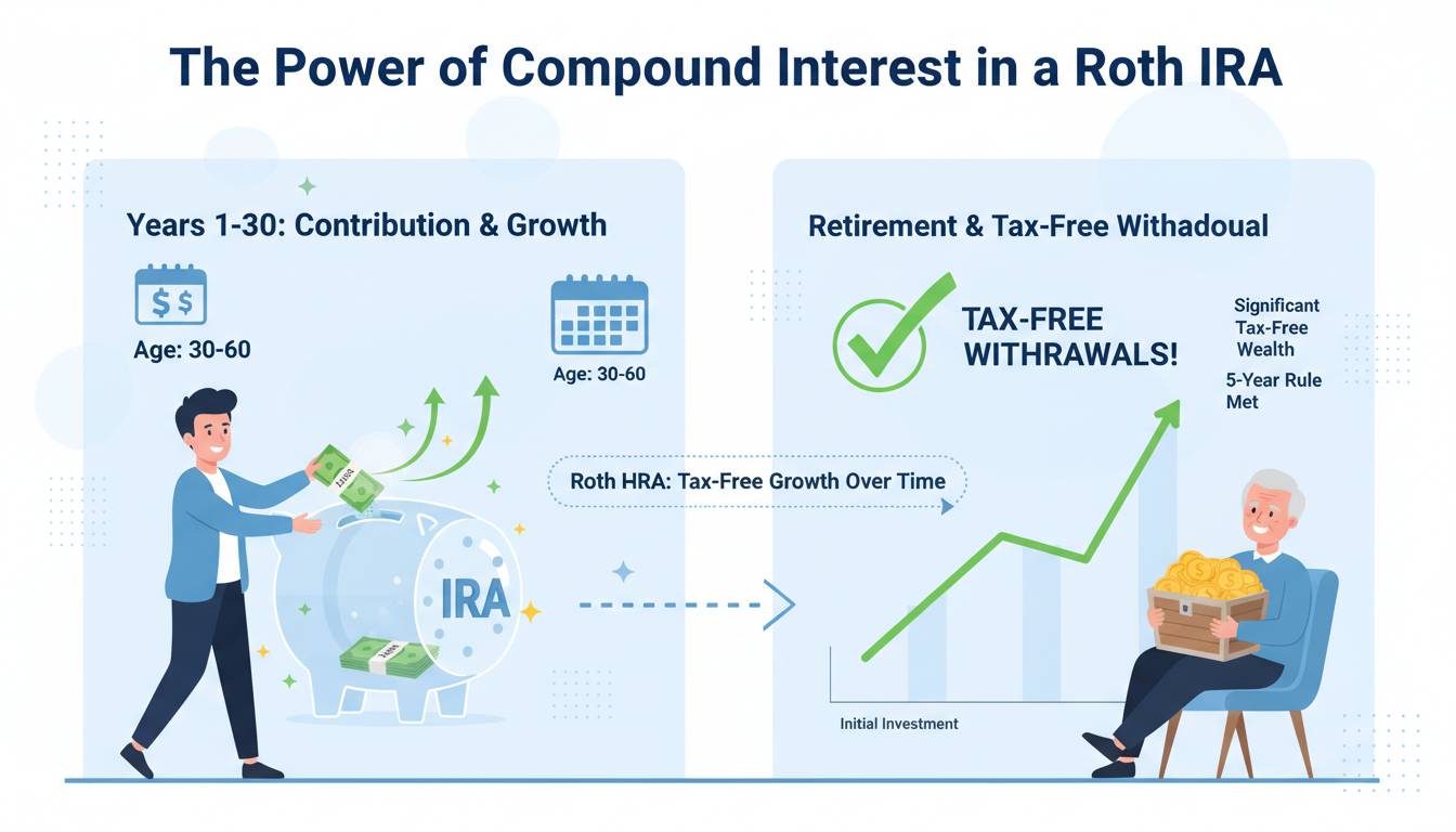 Understanding a Roth IRA starts with grasping the tax asymmetry at its core. When you contribute money to a Roth IRA, you do not get a tax deduction for that contribution. You’ve already earned that money, you’ve already paid income tax on it, and now you’re putting it into a retirement account. In exchange for paying taxes now, the government gives you something valuable: every penny of growth inside that account, and every dollar you withdraw in retirement, is completely free from federal income tax.
