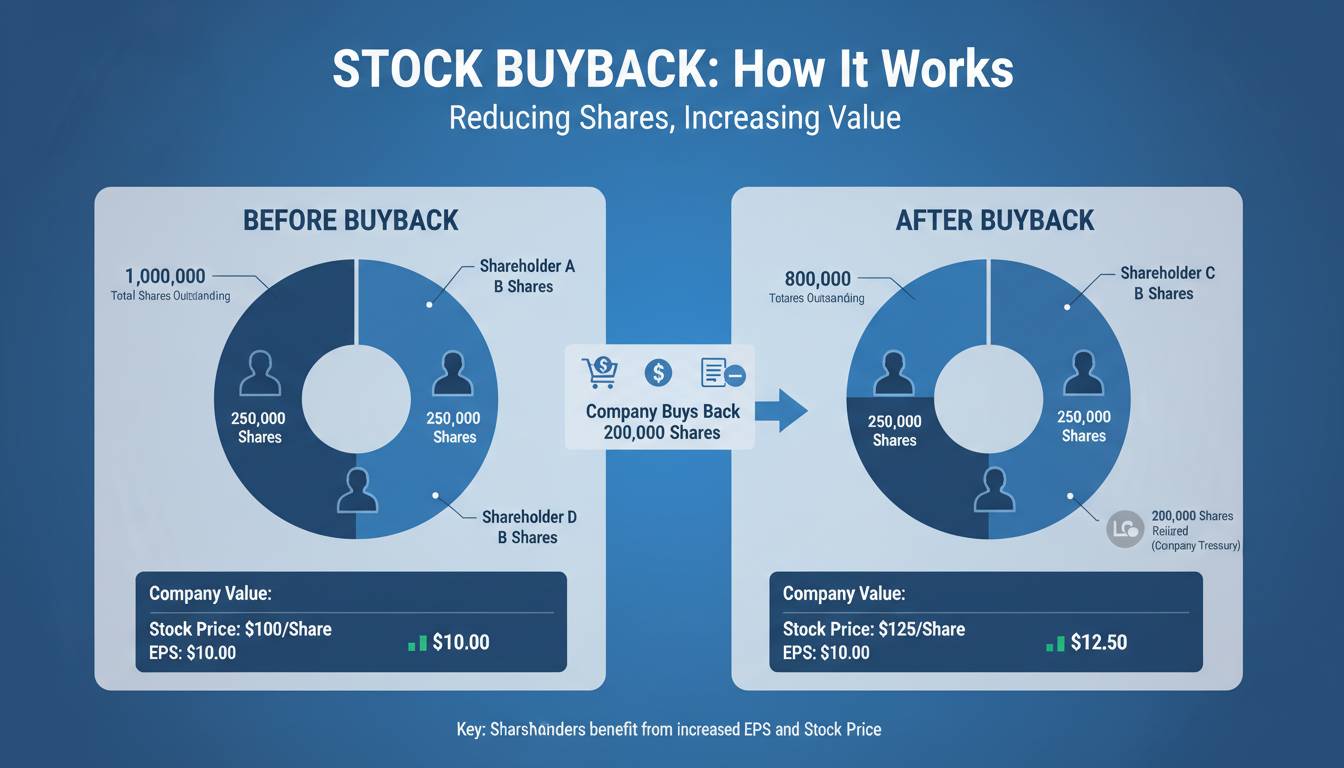 A stock buyback happens when a company purchases its own shares on the open market or directly from shareholders, reducing the number of outstanding shares in circulation. When a company buys back stock, it spends cash to acquire shares that then get retired or held as treasury stock. This reduces the denominator in the earnings-per-share calculation, which mechanically increases EPS even if operating earnings remain flat.