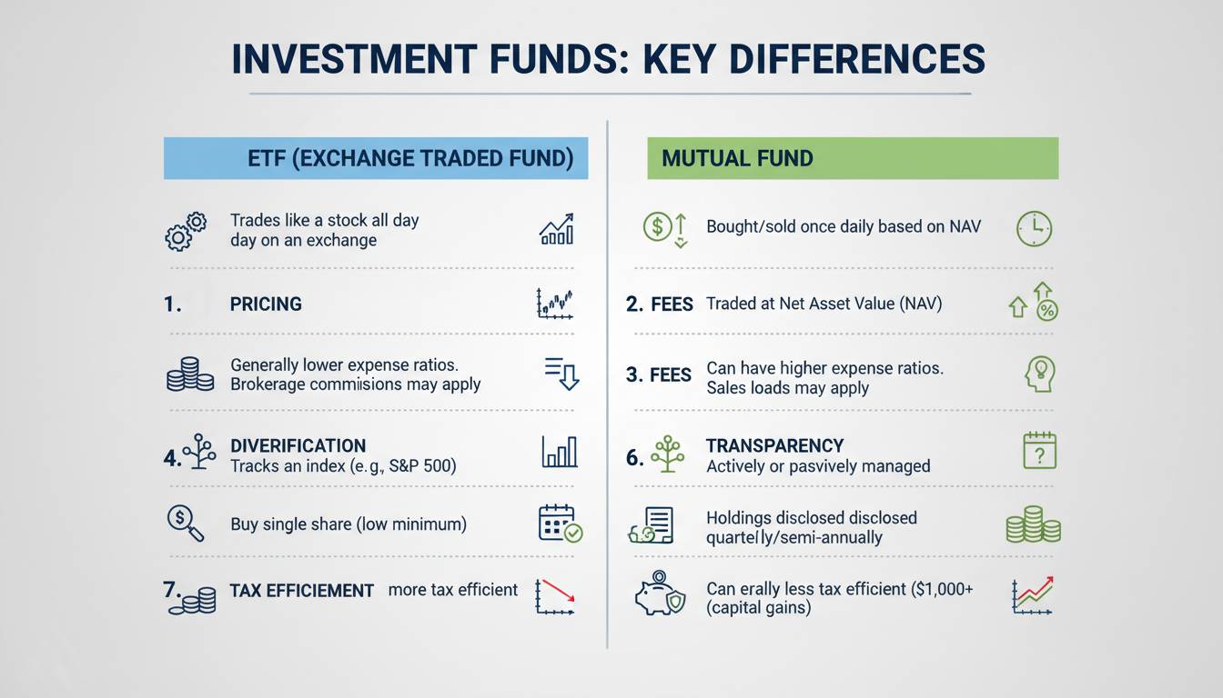 The primary differences involve trading flexibility, pricing, costs, and tax treatment. ETFs trade throughout the day on exchanges and price continuously; mutual funds price only once daily at the close. ETFs generally have lower expense ratios, particularly for passive strategies. ETFs are typically more tax-efficient in taxable accounts due to their structure. Mutual funds, especially active ones, offer professional management but usually at higher costs.